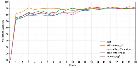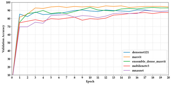 Figure 5 show how the validation accuracy changes over 20 epochs for the first and last five models. Most models showed a steady increase, with the performance stabilising after about 10 epochs. Models based on transformers, such as Maxvit-S, and ensemble models like DenseNet121 + MaxViT-S made fast progress early on, reaching over 90% accuracy within the first 7 epochs. In contrast, lightweight CNNs like MobileNetV3 took longer to converge, needing more epochs to reach a plateau.