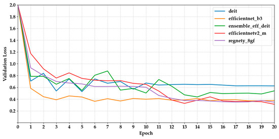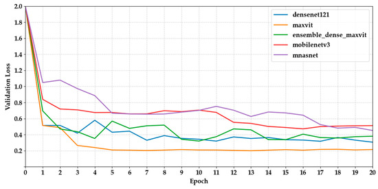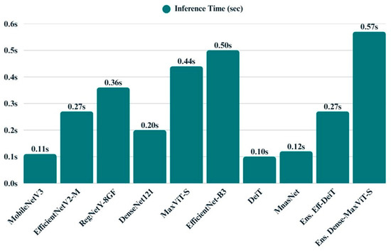 Figure 20). MobileNetV3, DeiT, and MNASNet demonstrate superior responsiveness, making them suitable for latency-sensitive applications. Models such as EfficientNet-B3, MaxViT-S, and the DenseNet121 + MaxViT-S ensemble exhibit longer inference times, primarily due to their increased architectural complexity. Others, like EfficientNetV2-M and RegNetY-8GF, strike a balance between speed and capacity, representing a middle ground in computational demand.