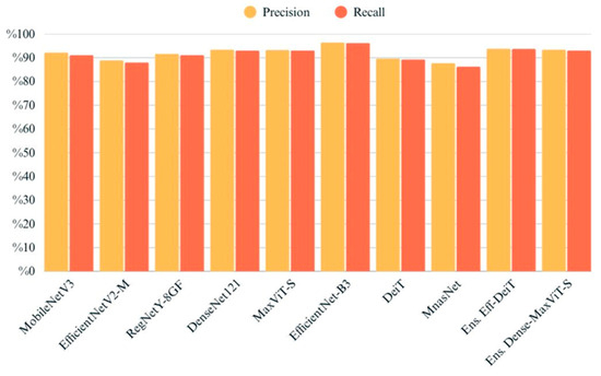 51]. Among single models, MaxViT-S and RegNetY-8GF showed superior performance, especially in recall and F1-score [