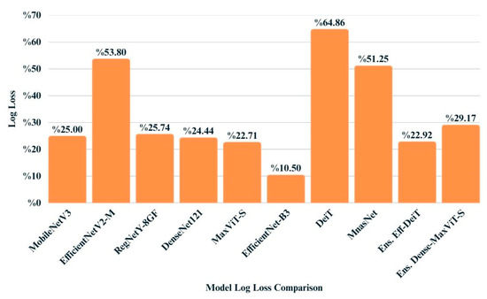 Table 5 provides a detailed comparative overview of classification performance metrics across all evaluated models. Among the individual architectures, EfficientNet-B3 achieved the best overall performance, exhibiting leading scores in accuracy (0.9623), precision (0.9640), recall (0.9618), F1-score (0.9623), and AUC (0.9993), while also yielding the lowest log loss (0.1050). RegNetY-8GF, DenseNet121, and MaxViT-S also performed competitively, with all three models surpassing the 0.9300 threshold in accuracy, recall, and F1-score. MobileNetV3 demonstrated a favorable balance between performance and simplicity, reaching an accuracy of 0.9119 and an AUC of 0.9955. DeiT, despite its architectural efficiency, delivered slightly lower metrics across the board, most notably in F1-score (0.8917) and specificity (0.9847). EfficientNetV2-M followed a similar trend, trailing in precision and recall, while MnasNet showed the lowest overall scores in nearly all metrics, with an F1-score of only 0.8580.
