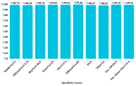 Figure 13). As visualized in the bar chart, most models achieved specificity above 0.98, with EfficientNet-B3 reaching the highest score of 0.9946. The narrow range of variation between 0.9803 and 0.9946 suggests that all architectures were highly reliable in avoiding false positives. This aligns with the observed class distribution, where misclassification of negative cases was relatively rare across the test set.