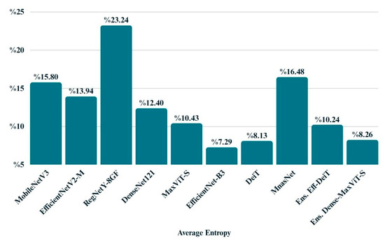 Figure 14, EfficientNet-B3 exhibited the lowest entropy (0.0729), reflecting highly confident predictions. DeiT and MaxViT also produced relatively low entropy values, suggesting stable and reliable decision-making. In contrast, models like RegNetY-8GF and MnasNet displayed higher entropy, indicating a greater level of uncertainty in their outputs. These findings align with the performance trends observed in other evaluation metrics and highlight the importance of entropy as a complementary measure when assessing model reliability.