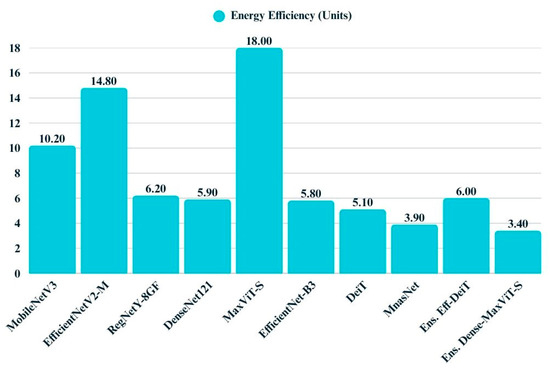 Figure 21). MobileNetV3, DeiT, and MNASNet demonstrate high efficiency, operating with minimal energy consumption and thus offering advantages for deployment in resource-constrained environments. In contrast, models such as MaxViT-S and EfficientNetV2-M incur substantial energy costs, reflecting their greater computational demands. Ensemble models exhibit mixed characteristics while some maintain moderate energy profiles, others introduce additional overhead due to their compounded architectures.