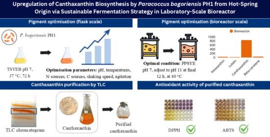 Upregulation of Canthaxanthin Biosynthesis by Paracoccus bogoriensis PH1 from Hot-Spring Origin via Sustainable Fermentation Strategy in Laboratory-Scale Bioreactor