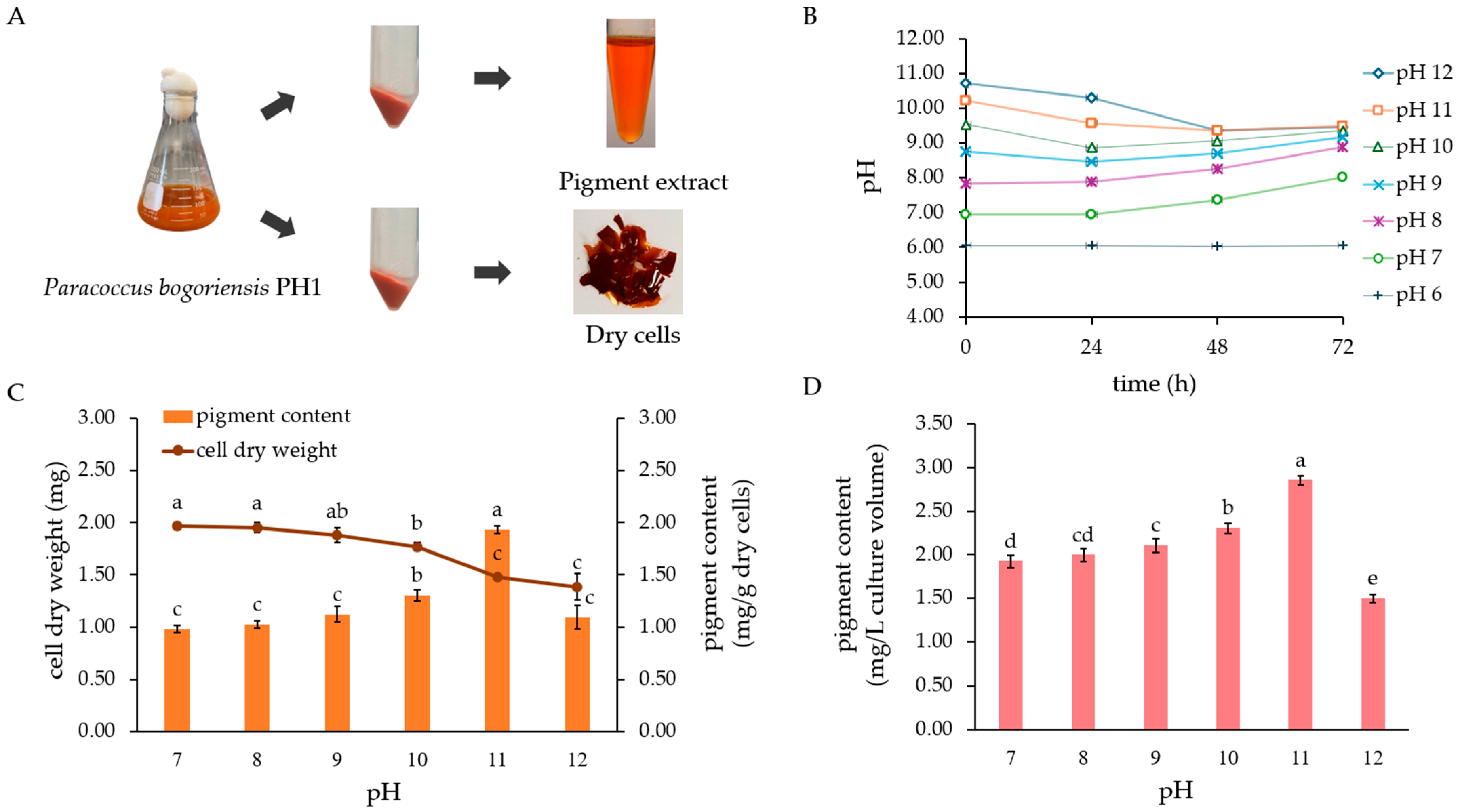 3.1. Effects of Intrinsic and Extrinsic Factors on Pigment Production by P. bogoriensis PH1 in Flask Culture