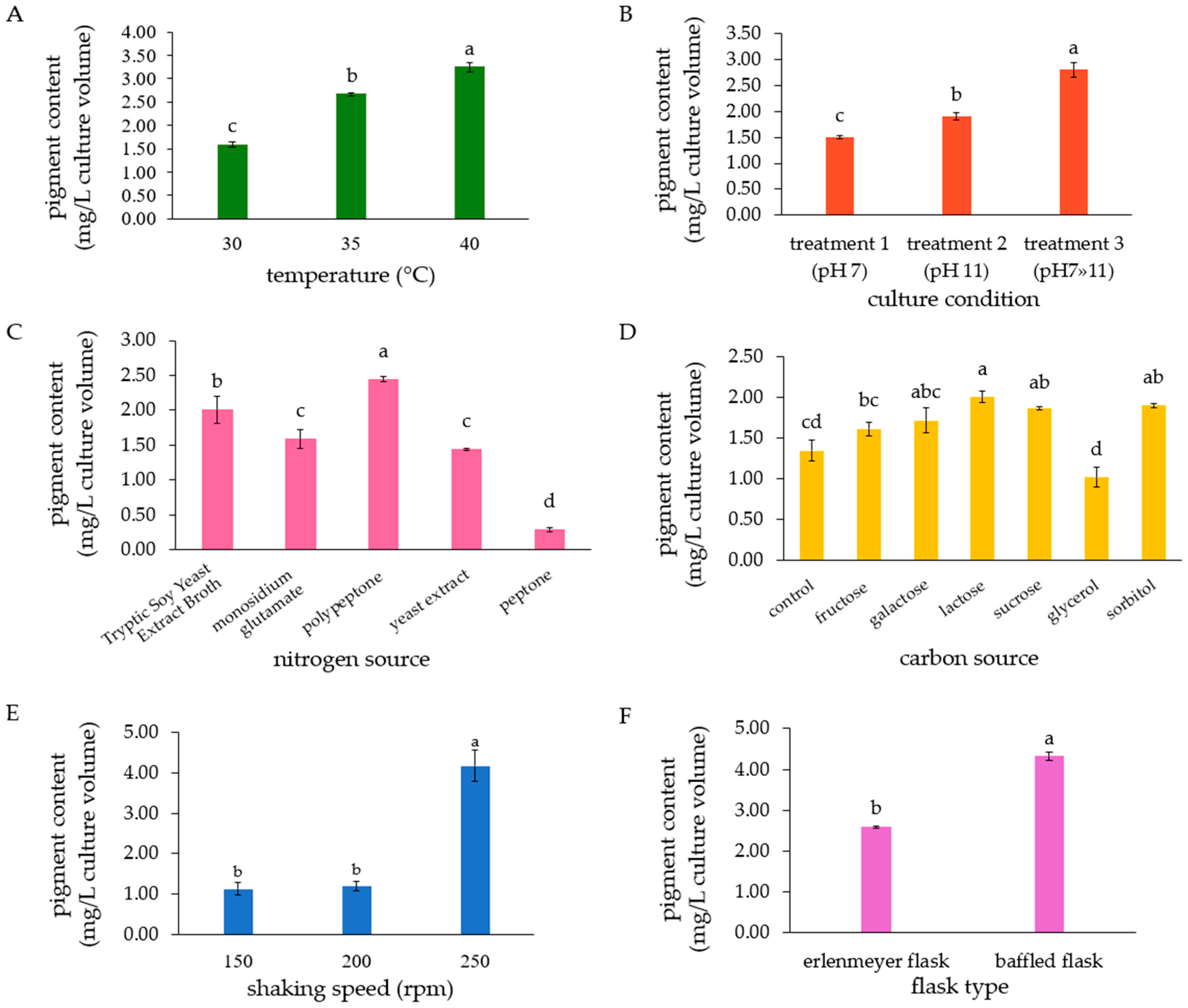 2.3. Investigation of the Effects of pH and Temperature on Growth and Pigment Production in Flask Culture