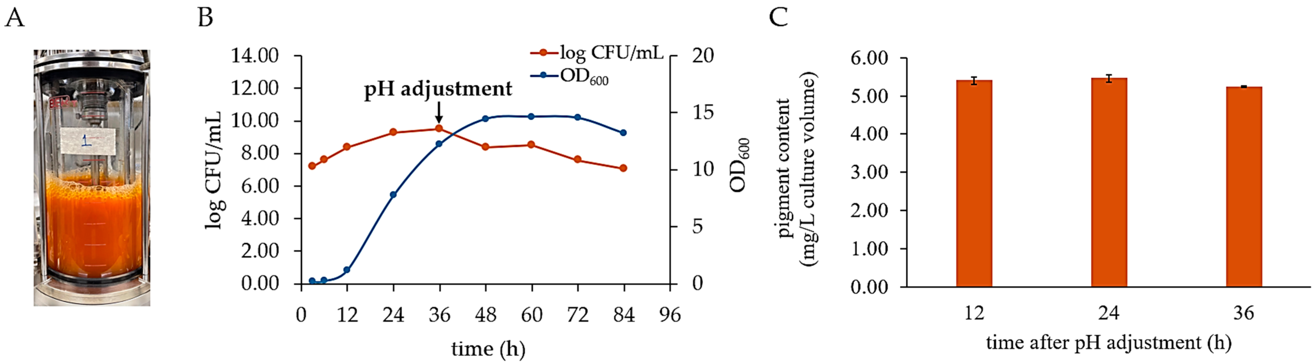 3.2. Growth Characteristics and Pigment Production by P. bogoriensis PH1 in Bioreactor