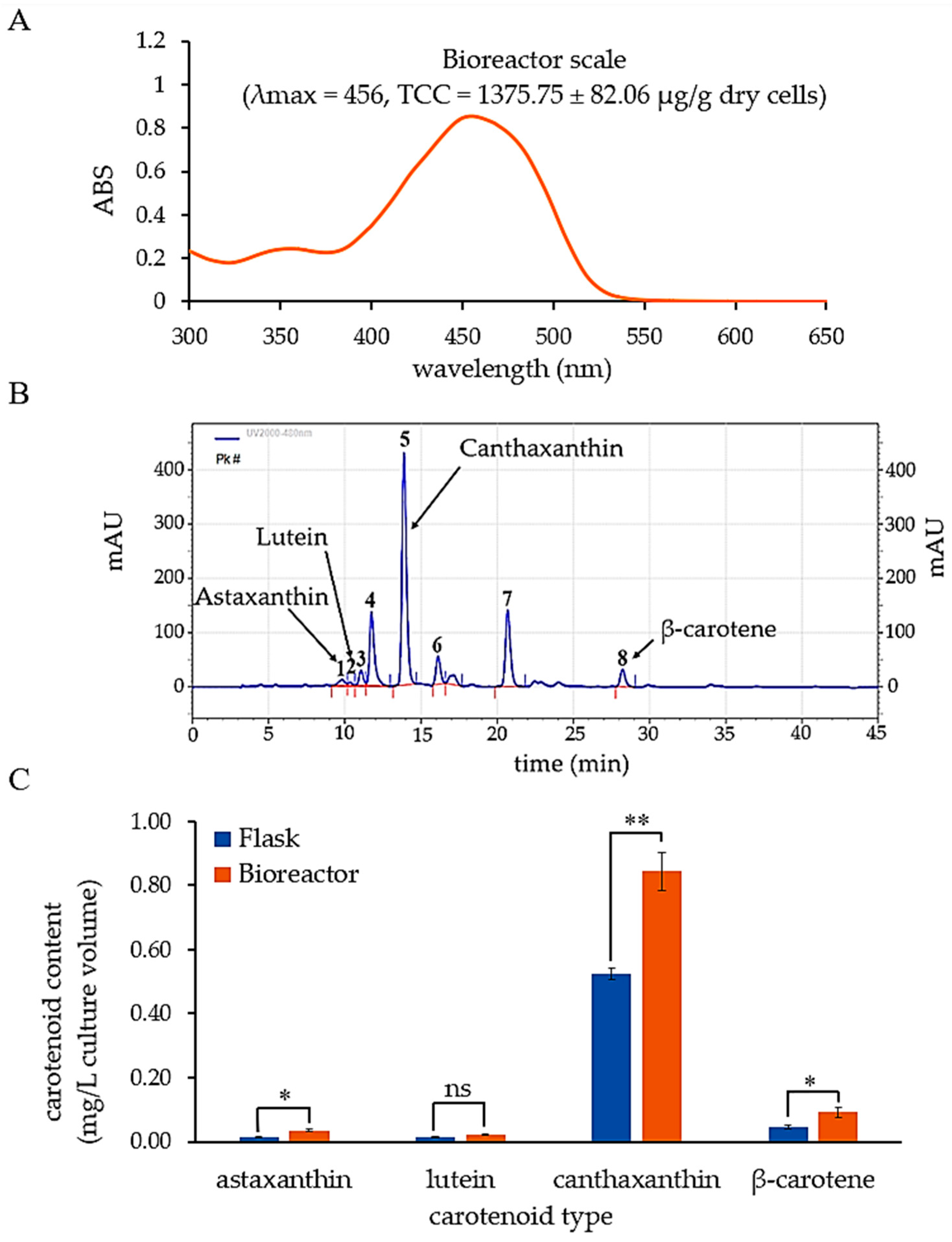 3.3. Carotenoid Production by P. bogoriensis PH1 in Bioreactor