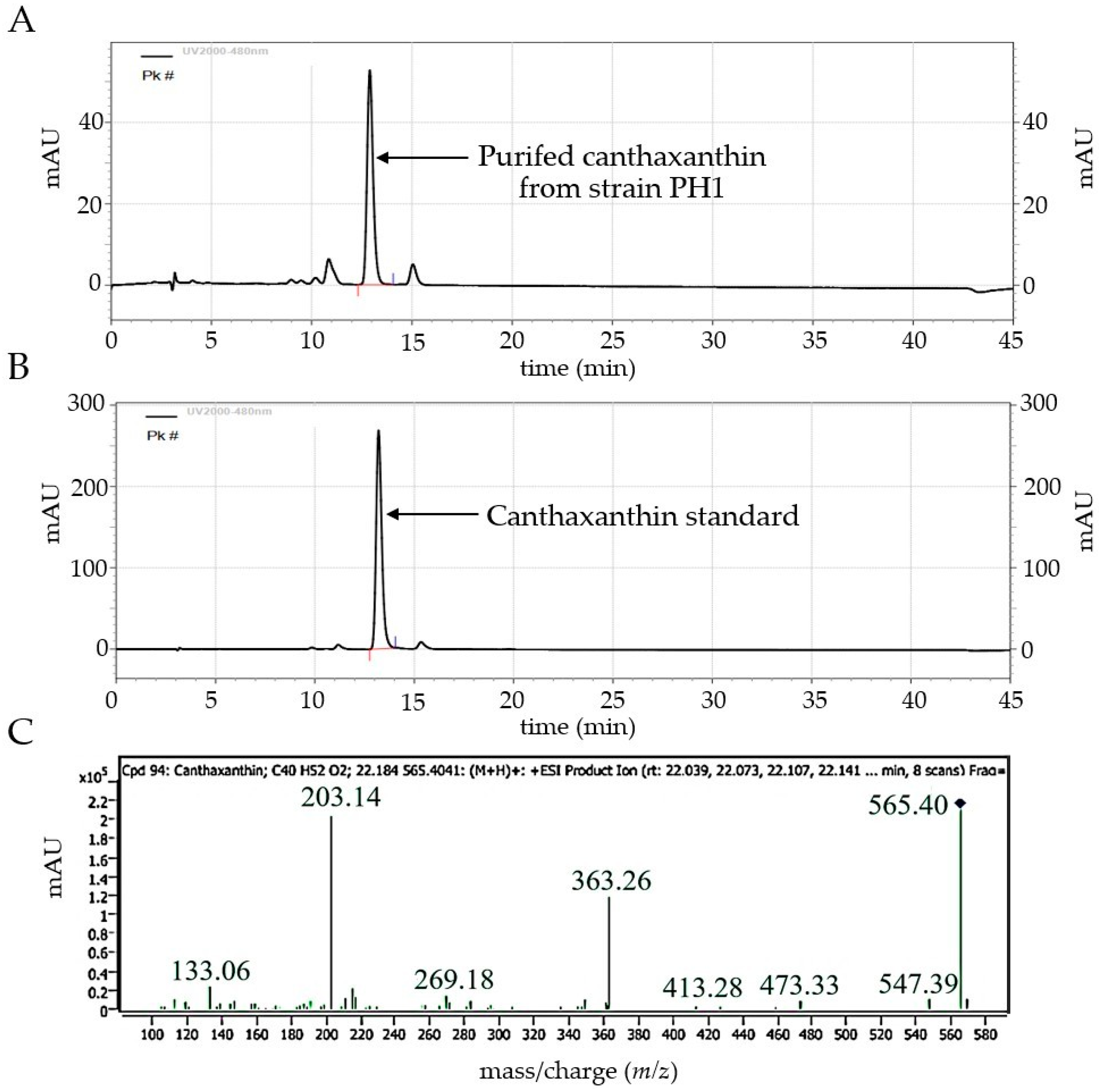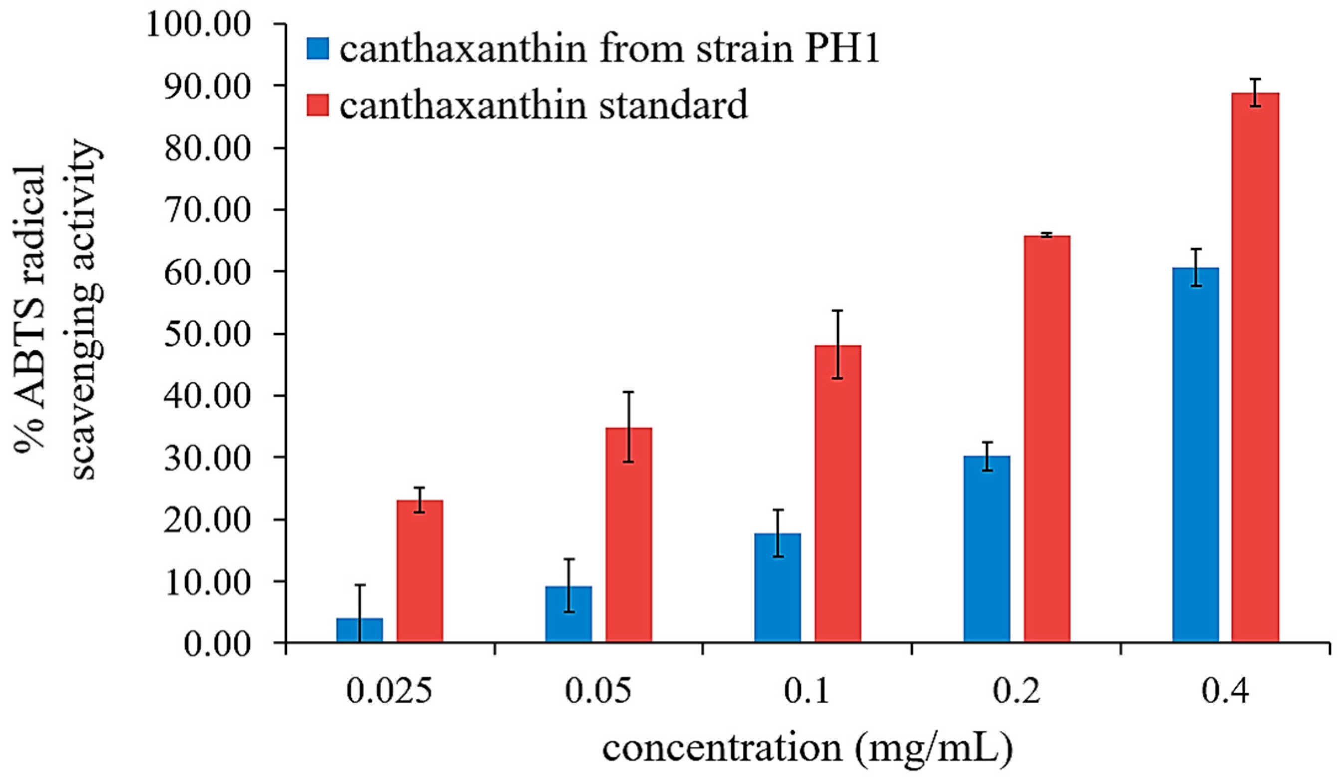 3.5. DPPH and ABTS Radical Scavenging Activity of Canthaxanthin Produced by P. bogoriensis PH1