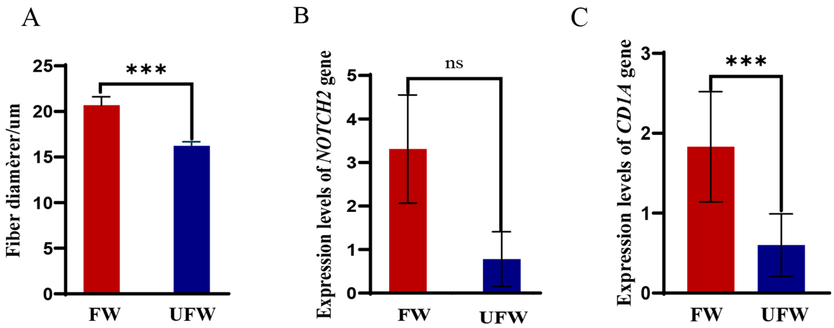 - Based on the results of MFD measurements, 10 sheep with the smallest MFD were designated as the ultra-fine wool fibre group (UFW, 16.21 ± 0.46 μm), and 10 with the largest MFD as the fine wool fibre group (FW, 20.68 ± 0.93 μm). For these two groups, additional wool samples were collected from the left forelimb and 5 cm posterior to the scapula and were further used to measure the MFD. 20 skin tissue samples (approximately 2 cm × 2 cm) from these two groups were collected using a skin sampler, immediately frozen in liquid nitrogen, and were further stored at −80 °C refrigerator for RNA extraction.