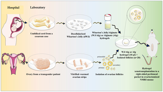 In summary, Wharton’s jelly (WJ) was derived from the umbilical cord and underwent a decellularization process. Then, WJ solution was prepared and composed with alginate 1.5% to create a final dWJ/Alg solution (with a concentration of 1%). Next, primordial, primary, and preantral follicles (30–150 µm) were isolated from vitrified–warmed ovarian strips. After evaluating the viability of isolated follicles, approximately 20 partially isolated follicles were inserted into 10 µL of dWJ/Alg solution as the experimental group or alginate (Alg) solution alone as the control group. After adding a CaCl2 bath, the final artificial ovaries (hydrogels containing follicles) were prepared. Subsequently, every artificial ovary was transplanted into a peritoneal pocket in the right side of the abdomen of ovariectomized NMRI mice. The grafts were extracted at different time intervals of 1, 2, 4, or 5 weeks to conduct histological and immunohistochemical evaluations. Additionally, blood serum was collected for hormonal analysis. There were three replicates for each group.