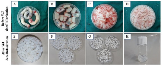 WJ processing overview. (A) Human umbilical cord (UC); (B) small UC fragments (10 × 5 × 1 mm3); (C) removal of vessel endothelial tissues for decellularization; (D) preparation of WJ pieces; (E,F) resulting decellularized WJ; (G) lyophilized WJ; (H) WJ hydrogel preparation.