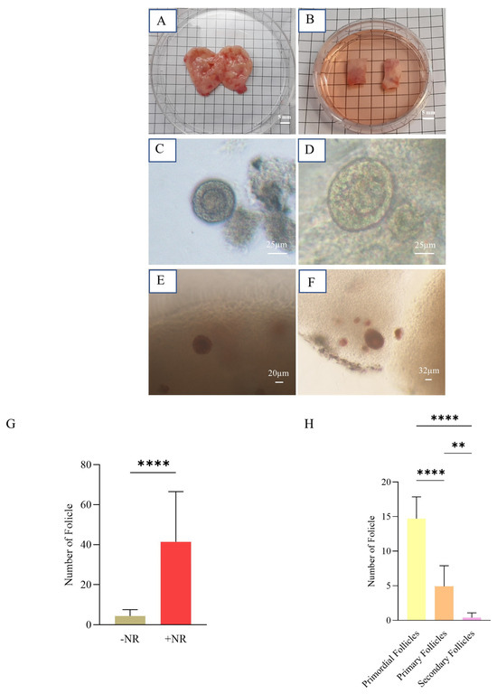 The comparison of follicles isolated with or without NR revealed a significant difference between the two groups. The number of isolated follicles was greater in the +NR group than in the −NR group (41.45 ± 25.14 vs. 4.36 ± 3.17), which can be attributed to the improved identification of follicles after staining (Figure 4G). This comparison shows an increase of 100% in the proportion of isolated follicles. Following isolation (as demonstrated in Figure 4H), approximately 160 follicles were retrieved from over 16 ovarian strips. Among them, 73.5% were classified as primordial follicles, which ranged between 30–60 µm. Primary follicles, measuring between 60 and 80 µm, made up 24.5% of the population. Secondary follicles, ranging between 80 and 150 µm, accounted for 2% of the population (Figure 4H).