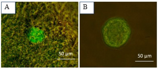 Follicular viability assessment using calcein-AM and ethidium homodimer-I. (A) A well-preserved primordial follicle embedded in the ovarian tissue and (B) an isolated secondary follicle.