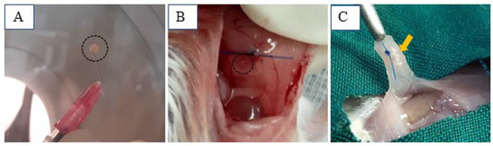 dWJ/Alg artificial ovaries in different conditions. (A) dWJ/Alg artificial ovary containing 20 human ovarian follicles before xenografting. (B,C) Transplantation site at the time of xenotransplantation (B (black circle) and 1 week later (C (yellow arrow)).