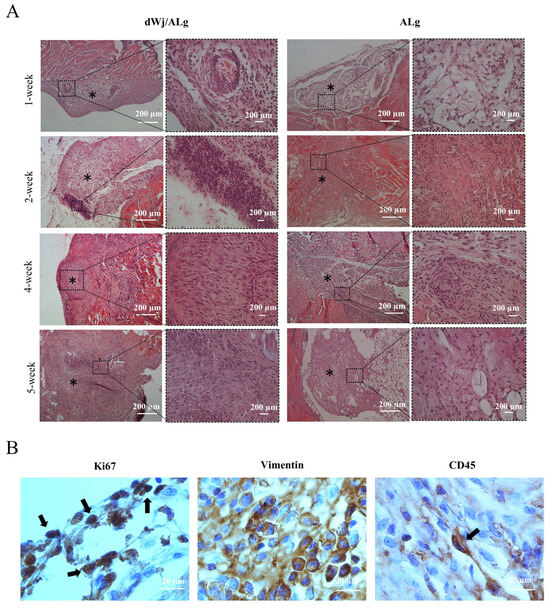 Histological analysis of transplanted artificial ovaries. (A) Histological staining was performed for dWJ/Alg and Alg artificial ovaries in different weeks (1, 2, 4, and 5 weeks). Although ovarian-like structures can be observed in all weeks, follicles can be seen in the 1-week xenotransplanted dWJ/Alg group.(Black stars (*) are ovarian-like structures) (B) Immunohistochemical staining. Vimentin- and Ki67-positive cells confirm the existence of human cells and their proliferation in the grafted dWJ/Alg artificial ovary (black arrows). Inflammatory CD45-positive cells can also be observed, but they are few in number (black arrow). Scale bar: 20 µm.