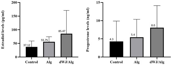 The hormonal analysis results for mouse blood serum are displayed in Figure 8. There was no significant difference in the level of either estradiol or progesterone between the dWJ/Alg and Alg groups.