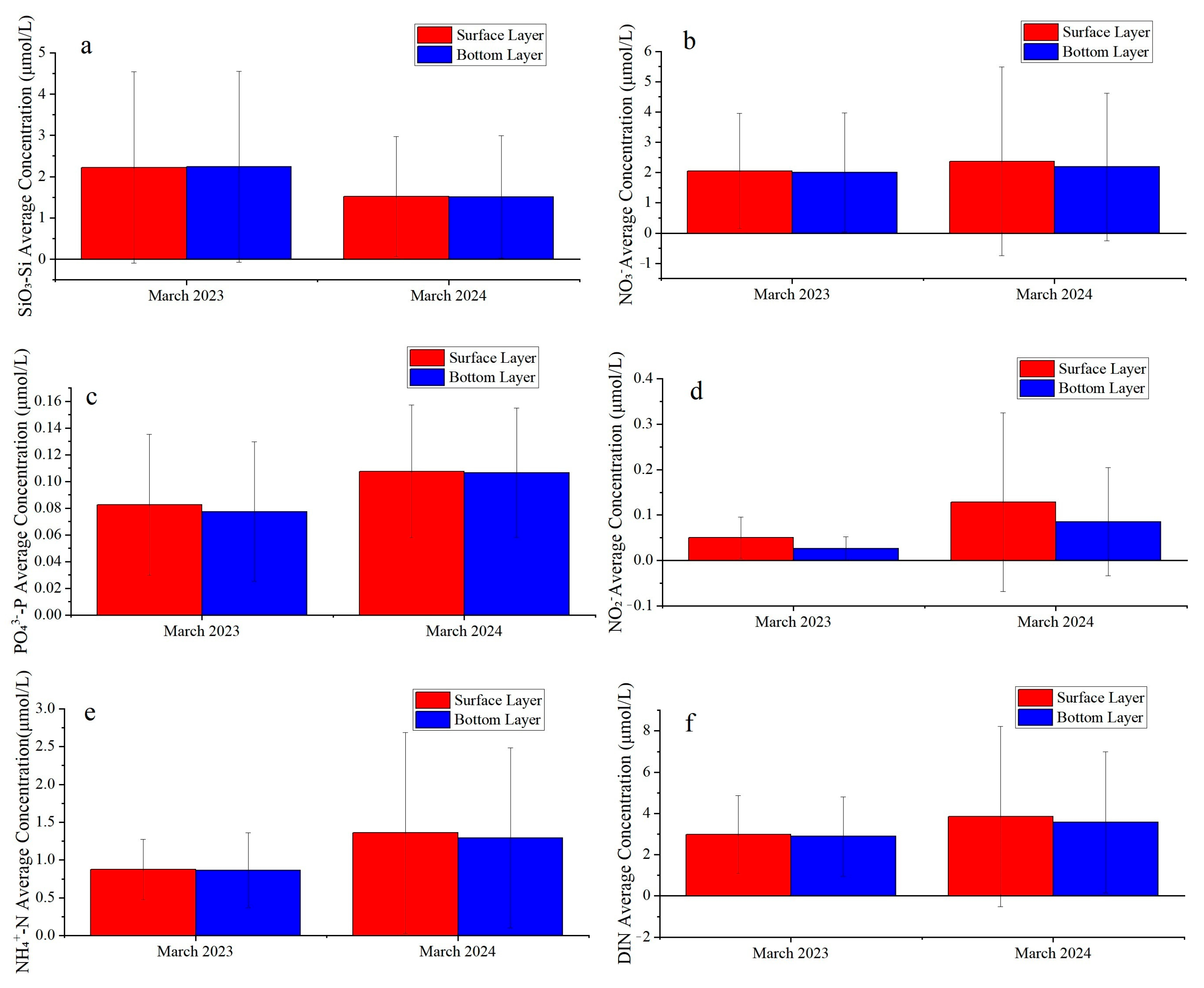 2023 | Surface layer | 30.42 ± 1.12 | 27.69~32.13 | 8.14 ± 0.05 | 8.06~8.22 | 280.84 ± 8.47 | 257.19~295.00 | 16.14 ± 7.91 | 7.81~47.50 |