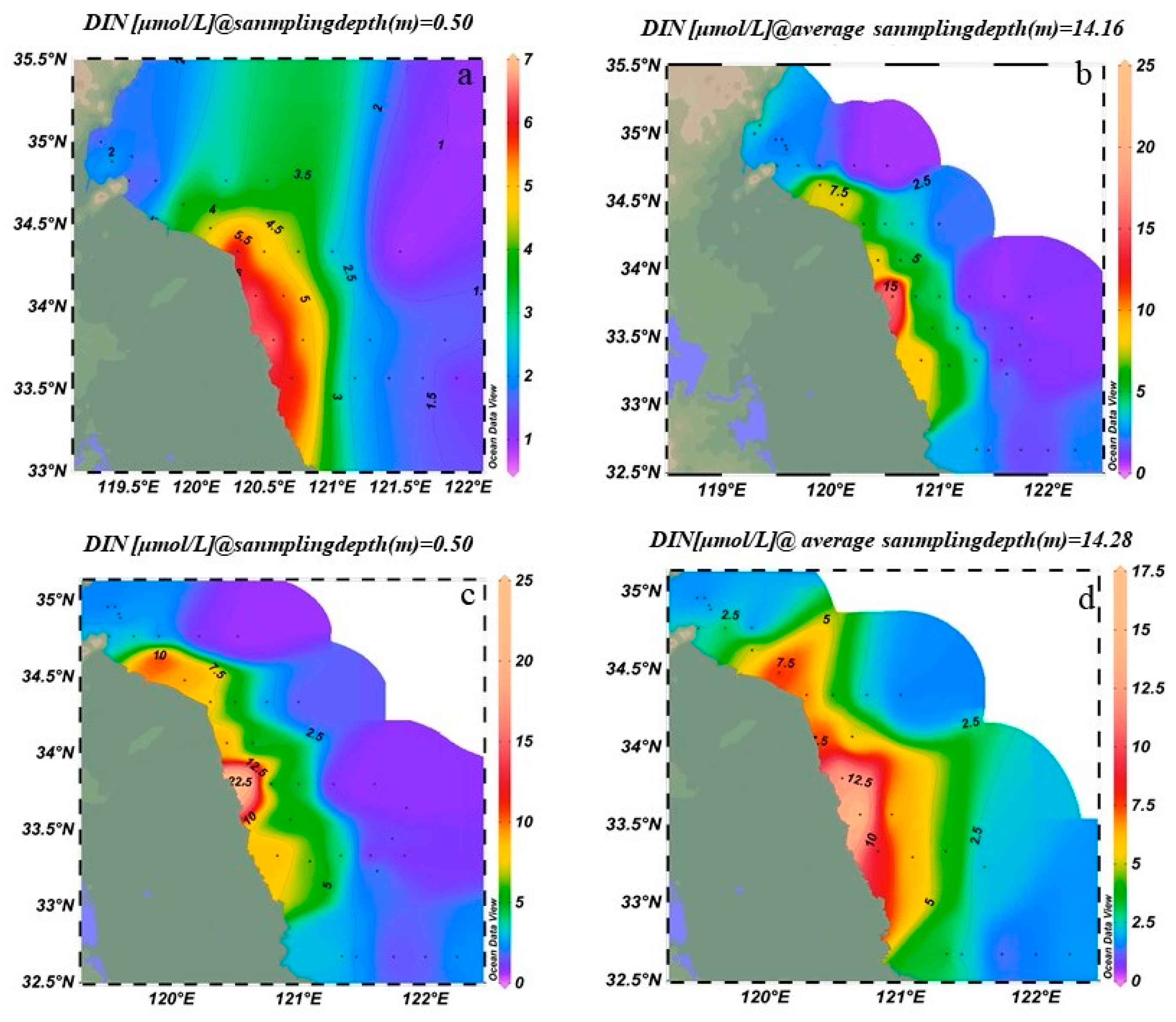 3.1.3. Spatial Distribution of Phosphate and Dissolved Inorganic Nitrogen in the Southern Yellow Sea