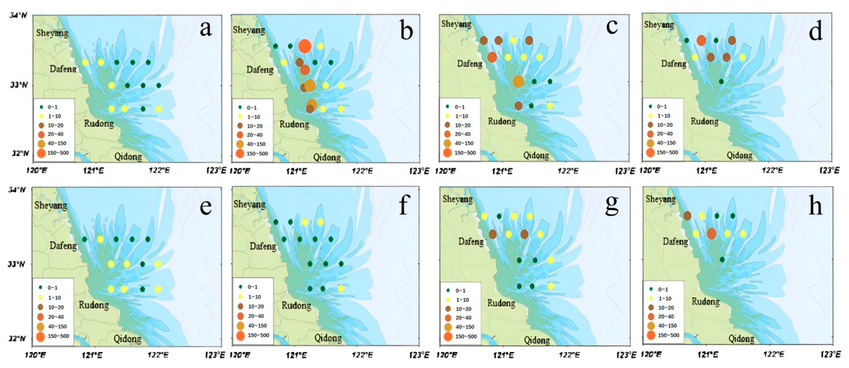 - Cao, J.X.; Zeng, Y.Q.; Xia, Z.Y.; Li, S.; He, P.M.; Zhang, J.H. Spatio-temporal distribution of micropropagules of green algae along the Jiangsu coast. Mar. Environ. Res. 2024, 198, 106533. [Google Scholar] [CrossRef]