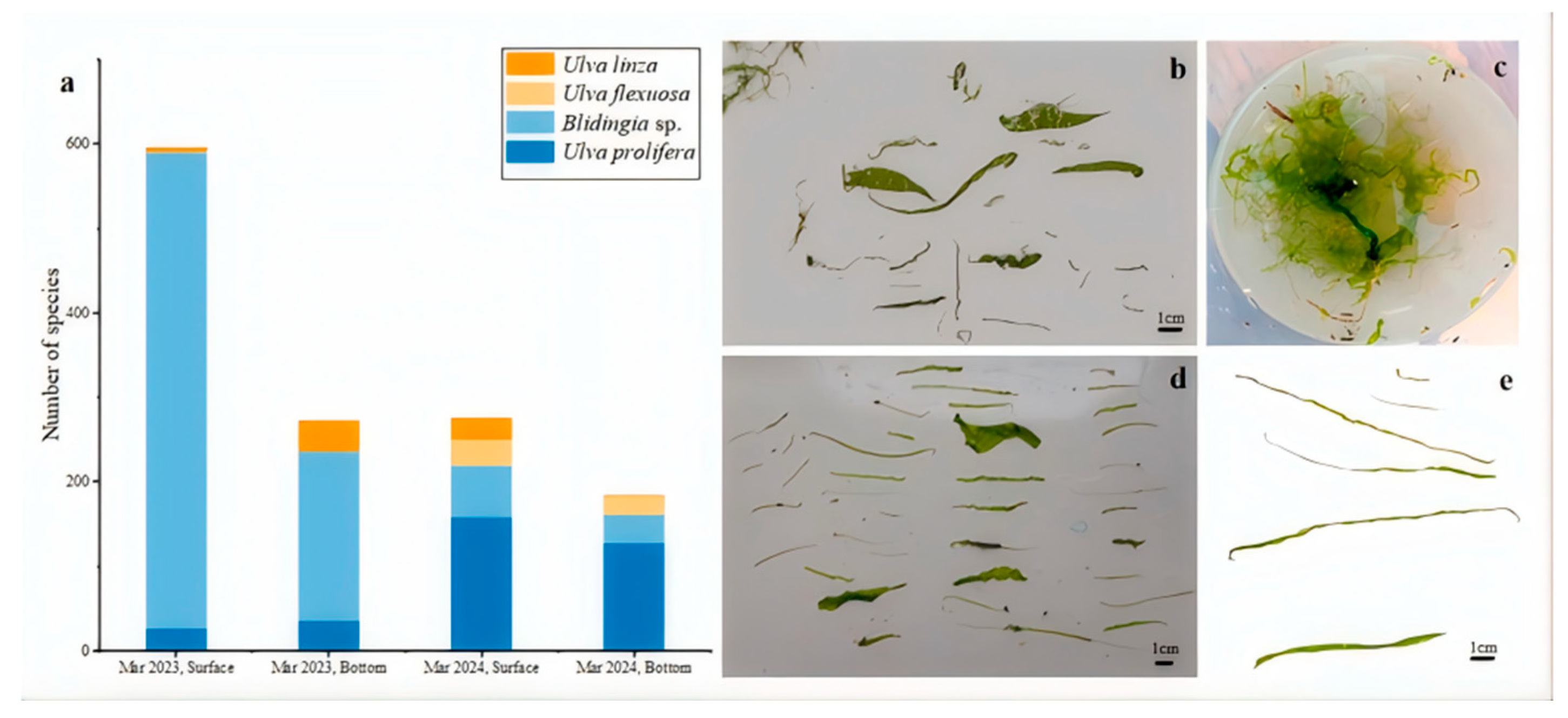 - Huan, L.; Gu, W.H.; Wang, X.L.; Yan, Y.R.; Tang, Q.; Han, X.; Wang, Z.X.; Zhou, K.; Qiu, Q.; Xu, J.T.; et al. Reproductive traits of floating Ulva prolifera sporophytes and gametophytes and their contribution to the Yellow Sea green tide. Mar. Pollut. Bull. 2025, 214, 117752. [Google Scholar] [CrossRef] [PubMed]