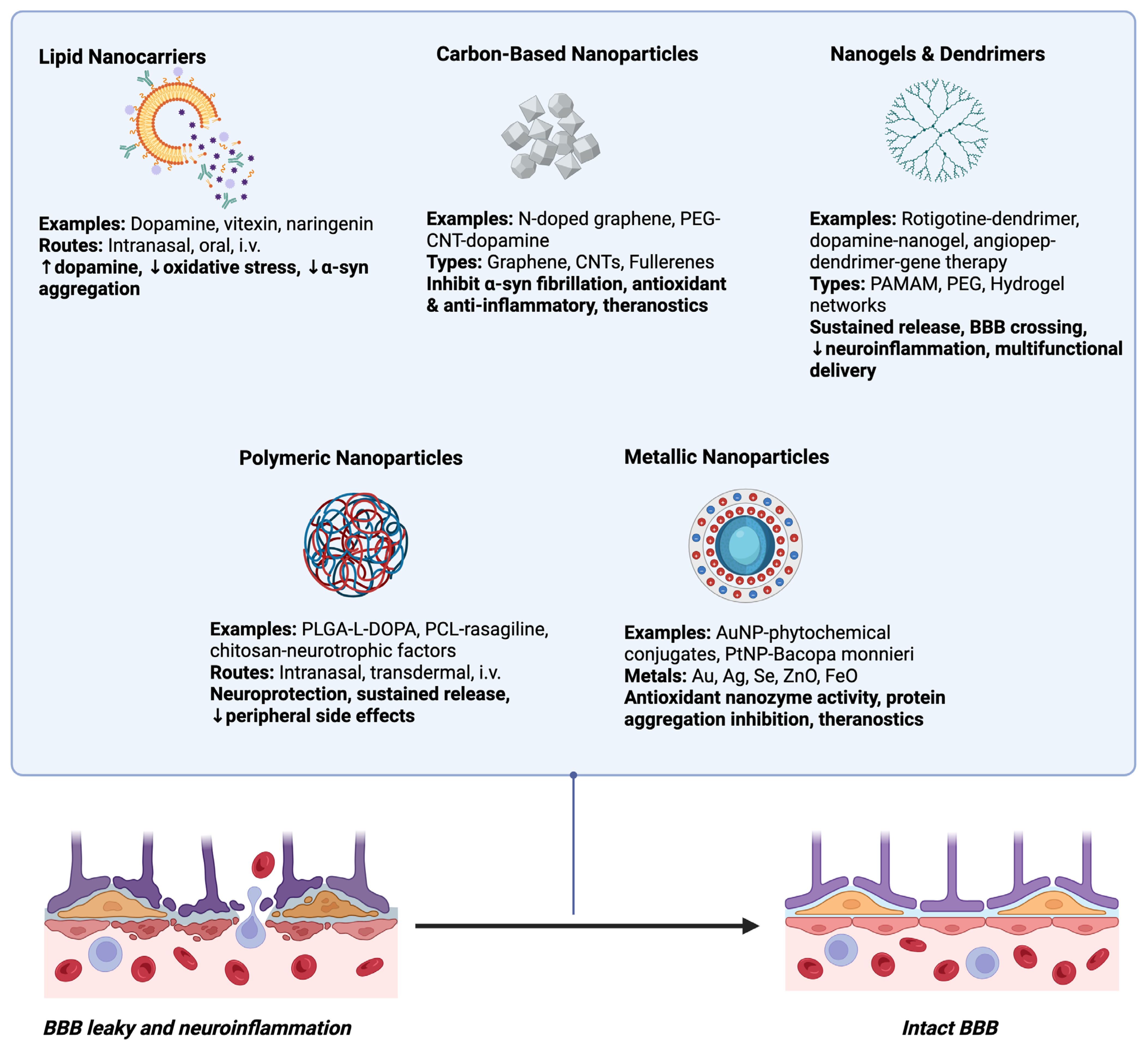 | Carbon-Based Nanoparticles (CBNPs) | Graphene, carbon nanotubes, fullerenes; unique electrical and mechanical properties | Dopamine delivery, inhibition of α-synuclein aggregation, antioxidant/anti-inflammatory effects | Strong BBB penetration, potential disease-modifying activity, high drug-loading capacity, theranostic potential | Biocompatibility and toxicity concerns; functionalization needed for safe use |