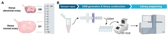 Sample collection and experimental workflow diagram. Notes: (A). Comparison chart of the sizes of horse abnormal ovary and horse normal ovary, (B). Single-cell sequencing flowchart.