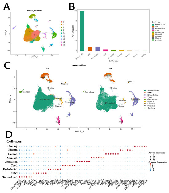 As shown in Figure 4A,B, no qualitative differences in cell type composition were observed between the DB and DY groups. A total of nine cell types were consistently identified across both groups: stromal cells, SMCs, endothelial cells, T cells, granulosa cells, myeloid cells, neurons, plasma cells, and cycling cells. Among these, the five most abundant cell types were stromal cells, SMCs, endothelial cells, T cells, and granulosa cells, with stromal cells representing the most abundant in both groups.