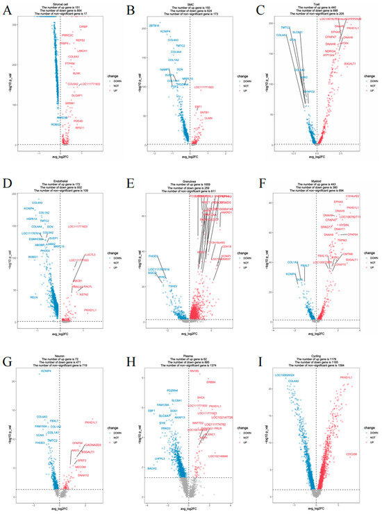 Volcano plots of significantly differentially expressed genes by cell type. Notes: (A). Stromal cells; (B). SMCs; (C). T cells; (D). Endothelial cells; (E). Granulosa cells; (F). Myeloid cells; (G). Neurons; (H). Plasma cells; (I). Cycling cells.