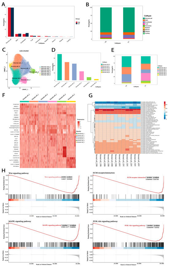 Expression Levels of Stromal Cell Subtypes. Notes: (A). Statistical chart of cell types in the DB group and DY group; (B). Proportion of cell type content within each group; (C). Principal component analysis diagram of cell subtypes; (D,E). Statistical chart of content of each cell subtype (F,G). Gene correlation heatmap within each cell subtype (H). GSEA Pathway Diagram.