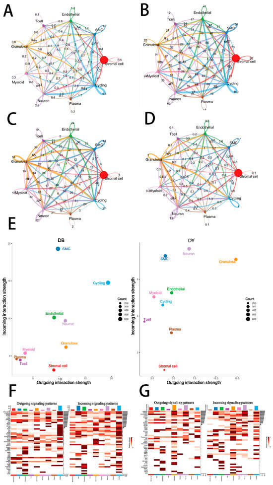 Cell–Cell Communication in Ovarian Tissue. Note: Colors represent different cell types. Circle size indicates the number of cells. Circles with outgoing arrows represent ligand-expressing cells; circles pointed to by arrows represent receptor-expressing cells. The thickness of the AC lines represents the number of ligand–receptor pairs between cell types, while the thickness of the BD lines indicates interaction strength between cell types. Panel (A–D) Cell Communication Diagram. Panel (E) shows scatter plots of incoming and outgoing interaction strength between cell types; Panels (F,G) show clustering analysis of cell–cell interactions in Kazakh horse ovarian tissue.