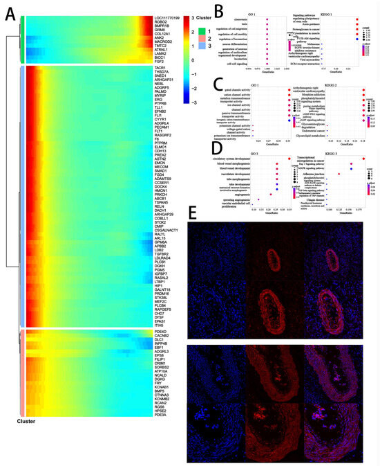 To explore cellular differentiation trajectories, we performed pseudotime analysis on the structural cell populations, including stromal cells, SMCs, endothelial cells, and granulosa cells from DB and DY ovarian tissues. Pseudotime analysis, which arranges cells along a virtual developmental timeline based on gene expression similarity, revealed that endothelial cells and SMCs occupied earlier differentiation stages, whereas stromal cells and granulosa cells were positioned at later stages along two distinct developmental branches. Interestingly, one trajectory of stromal cells paralleled that of granulosa cells, suggesting a possible shared developmental fate. Cluster analysis based on pseudotime-associated gene expression identified three distinct gene clusters (Figure 6A). Cluster 1 genes (e.g., LOC111770199, ROBO2, and GRM8) were upregulated along the pseudotime axis and enriched in biological processes related to cell migration, neuron differentiation, and multicellular development. Cluster 2 genes (e.g., TACR1, THSD7A, and SNED1) exhibited a downward trend and were associated with gated and cation channel activity, as well as metal ion transport. Cluster 3 genes (e.g., PDE4D, INPP4B, and EBF1) shared a similar decreasing pattern and were enriched in angiogenesis-related terms such as circulatory system development and blood vessel morphogenesis. These results collectively suggest that stromal and granulosa cell differentiation in the DY group involve enhanced regulation of migration, metabolism, neural signaling, and vascular development—processes essential for follicular growth and reproductive competence.