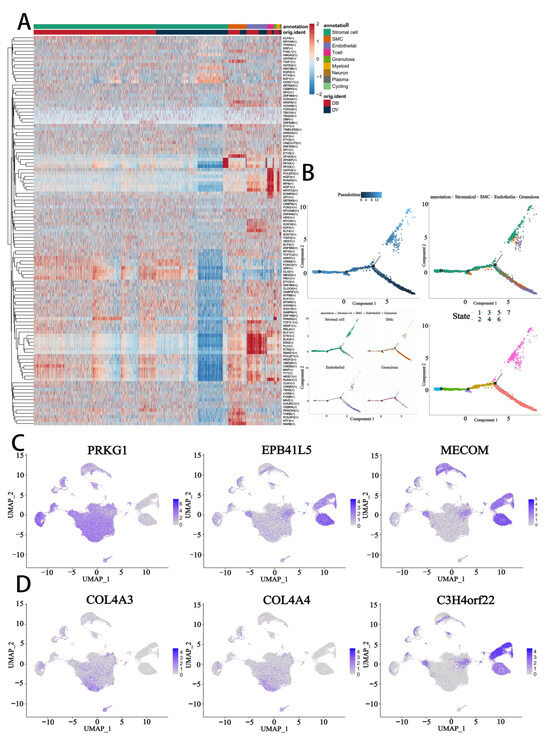 Pseudotime trajectory reconstruction confirmed a developmental progression originating from endothelial cells and bifurcating into two main lineages leading to SMCs, stromal cells, and granulosa cells. Importantly, stromal and granulosa cells shared similar pseudotime trajectories, implying a possible convergence of differentiation fate (Figure 7B), consistent with our earlier findings of stromal–granulosa similarity.