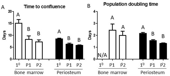 In vitro proliferation characteristics of bone marrow- and periosteum-derived cells during monolayer expansion. (A) Time to confluence of primary (1°), passage 1 (P1), and passage 2 (P2) bone marrow (white columns) and periosteal (black columns) cultures. (B) Population doubling times of bone marrow- and periosteum-derived cells. PDTs could not be calculated from the primary bone marrow cultures. Repeated measures one-way ANOVAs, mean + SEM, n = 5, p < 0.05. Within each cell type, groups with similar values are designated by the same letter. N/A, not applicable.
