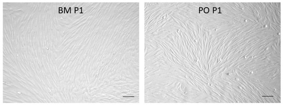 Morphologies of passage 1 (P1) BM and PO cells at confluence. Images were captured using a 10× objective (25× magnification). Size bars = 100 μm.