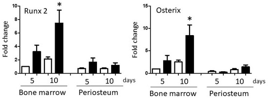 - Nakashima, K.; Zhou, X.; Kunkel, G.; Zhang, Z.; Deng, J.M.; Behringer, R.R.; de Crombrugghe, B. The novel zinc finger-containing transcription factor osterix is required for osteoblast differentiation and bone formation. Cell 2002, 108, 17–29. [Google Scholar] [CrossRef]