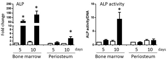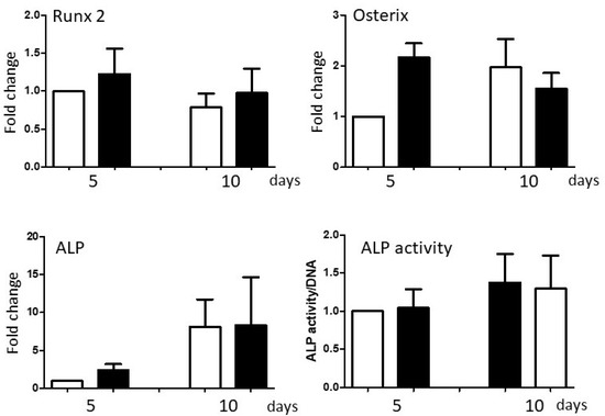 Impact of exogenous BMP-2 administration on periosteal cell osteogenesis. Expression of Runx2, Osterix, and ALP mRNAs and ALP activity were measured in P3 PO cells maintained in osteogenic medium (white columns) or in osteogenic medium supplemented with 100 ng rhBMP-2/mL (black columns) for up to 10 days. To normalize outcomes across individual donor experiments, ‘osteogenic medium day 5’ threshold cycle values or activities were designated as ‘1’, and other data sets adjusted accordingly. Repeated measures two-way ANOVAs, mean + SEM, n = 5, p < 0.05.
