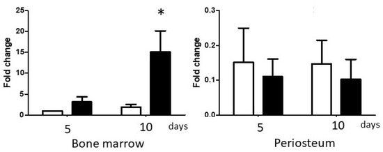 Changes in osteogenic transcription factor expression. Runx2 (left panel) and Osterix (right panel) mRNA expression in P3 bone marrow- and periosteum-derived cells maintained in Control (white columns) or osteogenic (black columns) medium for up to 10 days. In each experiment, BM ‘Control day 5’ threshold cycle values were designated as ‘1’, and other data sets adjusted accordingly. Within each cell type, values significantly different from day 5 Control values are indicated by asterisks. Repeated measures two-way ANOVAs, mean + SEM, n = 5, p < 0.05.
