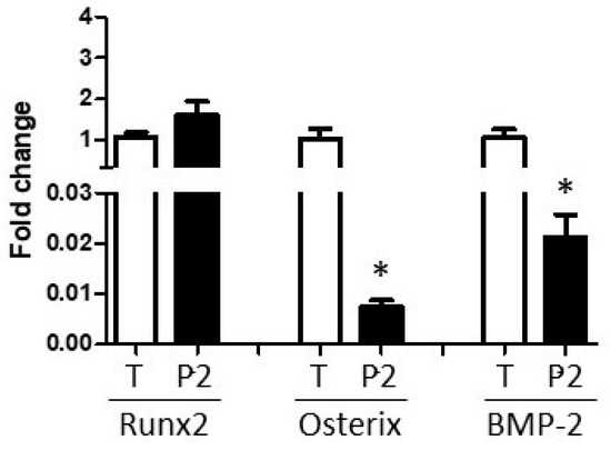 Impact of periosteal cell isolation and expansion on Runx2, Osterix, and BMP-2 expression. The mean tissue (T) sample threshold cycle of each gene was assigned a value of ‘1’ and the donor-paired expression levels at the time of passage 2 (P2) lifting were adjusted accordingly. P2 values significantly different from tissue expression are indicated by asterisks. Paired t tests, mean + SEM, n = 5, p < 0.05.