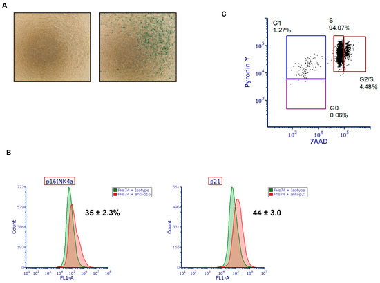 To determine the presence of senescent cells within our population of fetal small intestinal epithelial cells (FHs74), we performed staining using the Senescence β-Galactosidase Staining Kit to detect SA-β-gal activity, along with immunostaining for p16INK4a and p21, two well-established markers of cellular senescence [18,19,20]. The results revealed a substantial proportion of cells positive for these markers, indicating the presence of a senescent subpopulation (Figure 1A,B). Notably and as expected, the levels of p16 and p21 expression were consistent with the intensity of β-galactosidase activity, supporting a strong association between these markers and the actual senescent phenotype in our cell model. In addition, cell cycle phase analysis using Pyronin Y/7-AAD staining revealed that only a small fraction of cells were in G0 (quiescent phase) and G1, while most were in S phase (Figure 1C).
