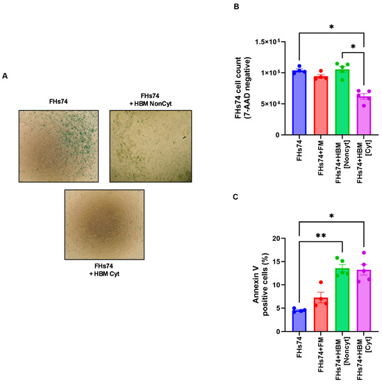 Exposure of FHs74 cells to HBM showed variable effects on the number of cells recovered post-treatment (Figure 2A,B). Indeed, the analysis of this result allowed us to distinguish two categories of HBM: non-cytotoxic HBM (Noncyt), which did not induce significant cell loss, and cytotoxic HBM (Cyt), which caused a marked decrease in the number of viable FHs74 recovered after exposure (Figure 2B). In addition, we assessed annexin V expression to evaluate membrane destabilization and early apoptotic events. Interestingly, both types of HBM significantly increased annexin V staining (Figure 2C), suggesting that HBM exposure affects membrane integrity regardless of its cytotoxic classification. However, only Cyt-HBM led to substantial cell loss, indicating that while both HBM types may initiate membrane perturbation, only Cyt-HBM drives cell death, likely through a selective mechanism targeting senescent cells.