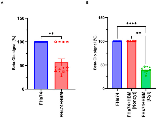 In addition, to further confirm the impact of HBM on FHs74 cells, the beta-glo assay system, a homogeneous method used to quantify β-galactosidase expression in mammalian cells, was employed (Figure 3). The results of this assay closely mirror those obtained from cell viability assays, reinforcing the classification of HBM samples into cytotoxic and non-cytotoxic categories. Cyt-HBM samples consistently showed both a significant reduction in β-galactosidase activity and a marked loss of viable cells, supporting their senolytic potential. In contrast, Noncyt-HBM samples had minimal impact on both cell viability and senescence marker expression.