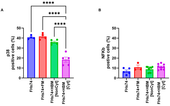 p38 Mitogen-Activated Protein Kinase (MAPK) and NFκB play a significant role in cellular senescence [21,22]. Therefore, we assessed the expression level of both p38 and NFκB in FHs74 before and after exposure to both Noncyt-HBM and Cyt-HBM. Our results revealed a significant reduction in p38 expression following exposure to Cyt-HBM, whereas no modulation was observed with Noncyt-HBM (Figure 4A). In contrast, NFκB expression levels were not significantly affected by exposure to either group of HBM (Figure 4B).