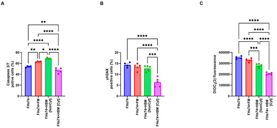 Treatment of FHs74 cells with Noncyt-HBM or Cyt-HBM showed different results compared to formula milk. Both Noncyt-HBM had significant effect on caspase activity(Figure 5A). Additionally, the expression of the DNA damage marker γH2AX was reduced considerably in the recovered FHs74 cells following exposure to Cyt-HBM (Figure 5B). Moreover, a significant depolarization of the mitochondrial membrane was observed in these cells, indicating cellular stress (Figure 5C).