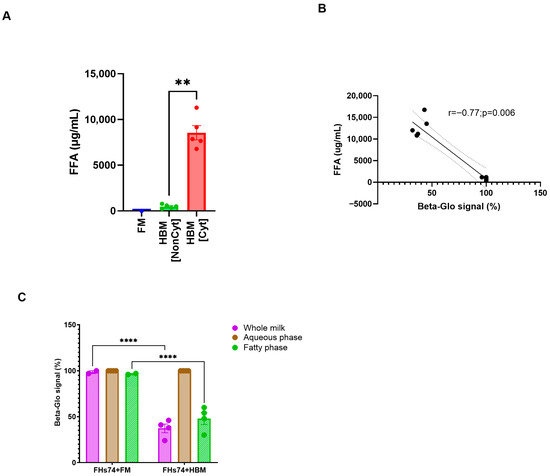 Fatty acid fraction and HBM cytotoxicity. (A) Quantification of FFA levels across HBM samples (n = 10). (B) Correlation between FFA concentration and Beta-glo signal (n = 10). (C) Beta-glo signal after exposure to whole HBM, aqueous, and fatty fractions (n = 4). Data are presented as Mean and standard error of the mean (SEM); ** p ≤ 0.01; **** p ≤ 0.0001. FHs74 = FHs74 intestinal cells alone; FHs74 + FM = FHs74 intestinal cells exposed to formula milk; FHs74 + HBM = FHs74 intestinal cells exposed to human breast milk.