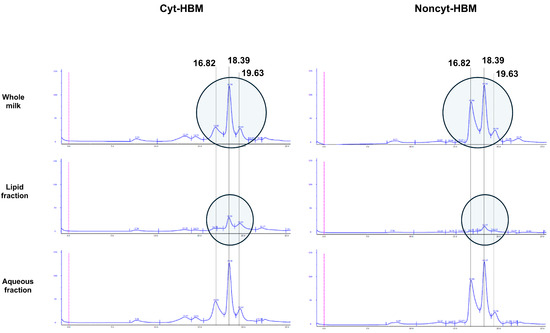 Since the HBM phases were obtained by centrifugation, SEC analyses were performed to characterize the composition of the various HBM phases. As shown in Figure 7, a reduction in the concentration of a compound eluting at 16.82 mL was observed in the whole Cyt-HBM compared to the entire Noncyt-HBM. The chromatographic profiles of the aqueous fractions also differed between Cyt-HBM and Noncyt-HBM. Finally, in the lipid phase, we noted a marked increase in the compound eluting at 18.39 mL in Cyt-HBM compared to Noncyt-HBM.