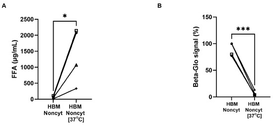 In addition, some selected Non-cytotoxic-HBM (Noncyt-HBM) samples were incubated at 37 °C for four days to increase their FFA levels [15,16,17]. After this incubation period, the quantity of FFA was measured and their senolytic capacity evaluated through the β-galactosidase activity measured using the beta-glo assay as described in the previous sections.