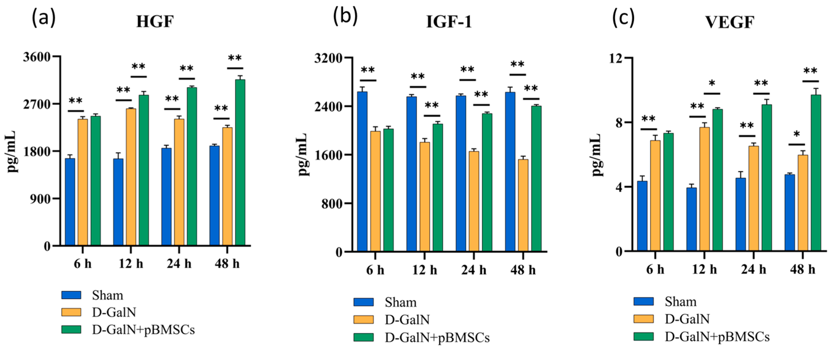 3.8. pBMSC Transplantation Upregulates Serum Growth Factor Levels in ALF Rats