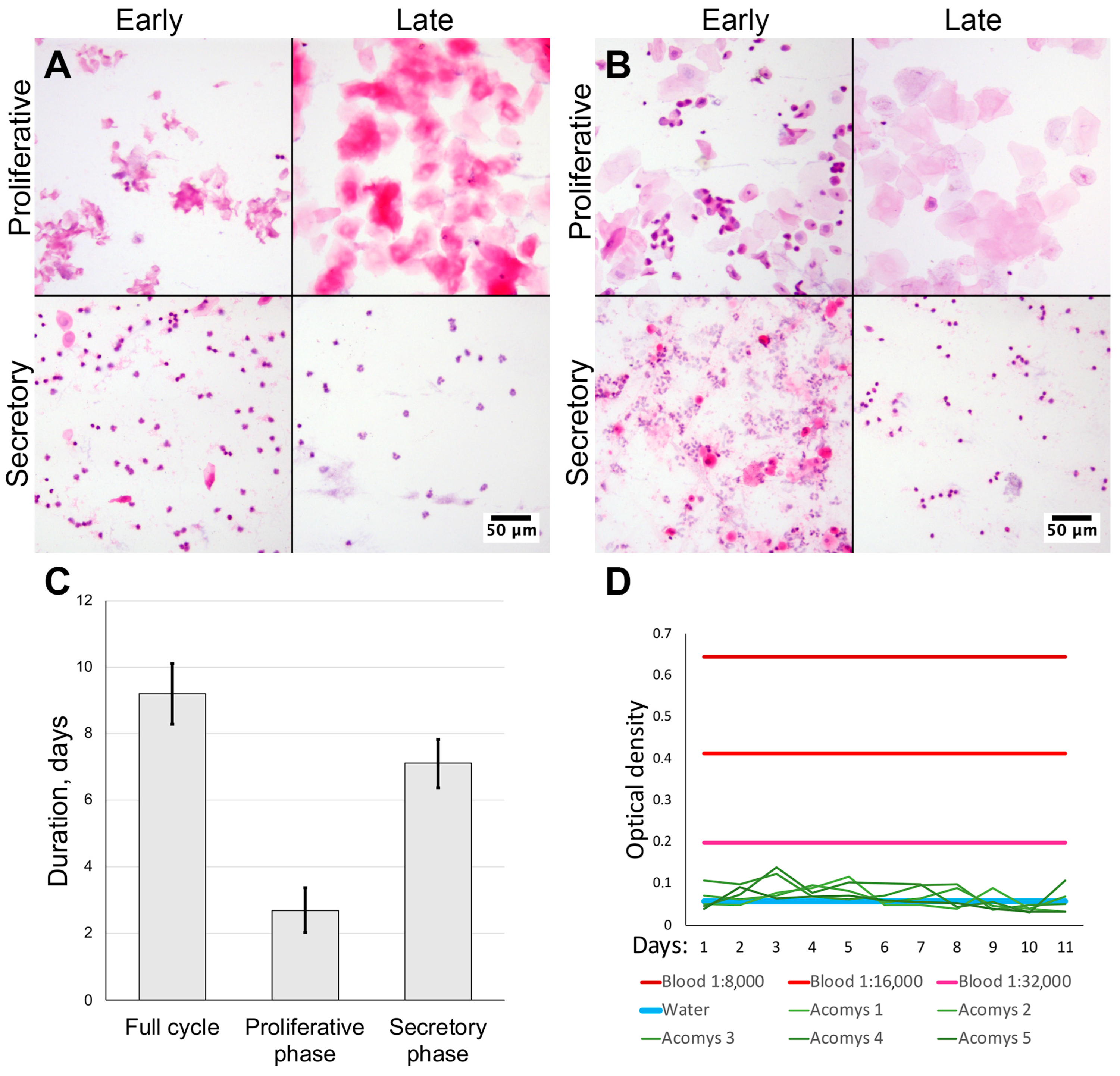 General concept was based on comparative analysis of uterine cycles in female wild-type spiny mouse and CD1 mouse strain (Mus musculus). For this purpose, vaginal swabs with subsequent staining were used to determine the timespan of the cycle, and occult blood tests were used to detect blood in the vaginal discharge. To assess the level of progesterone, blood serum from the heart cavity was used for enzyme immunoassay. Eventually we obtained uterine samples for histological staining and immunofluorescent labeling followed by light or fluorescent confocal microscopy to analyze the morphological dynamics.