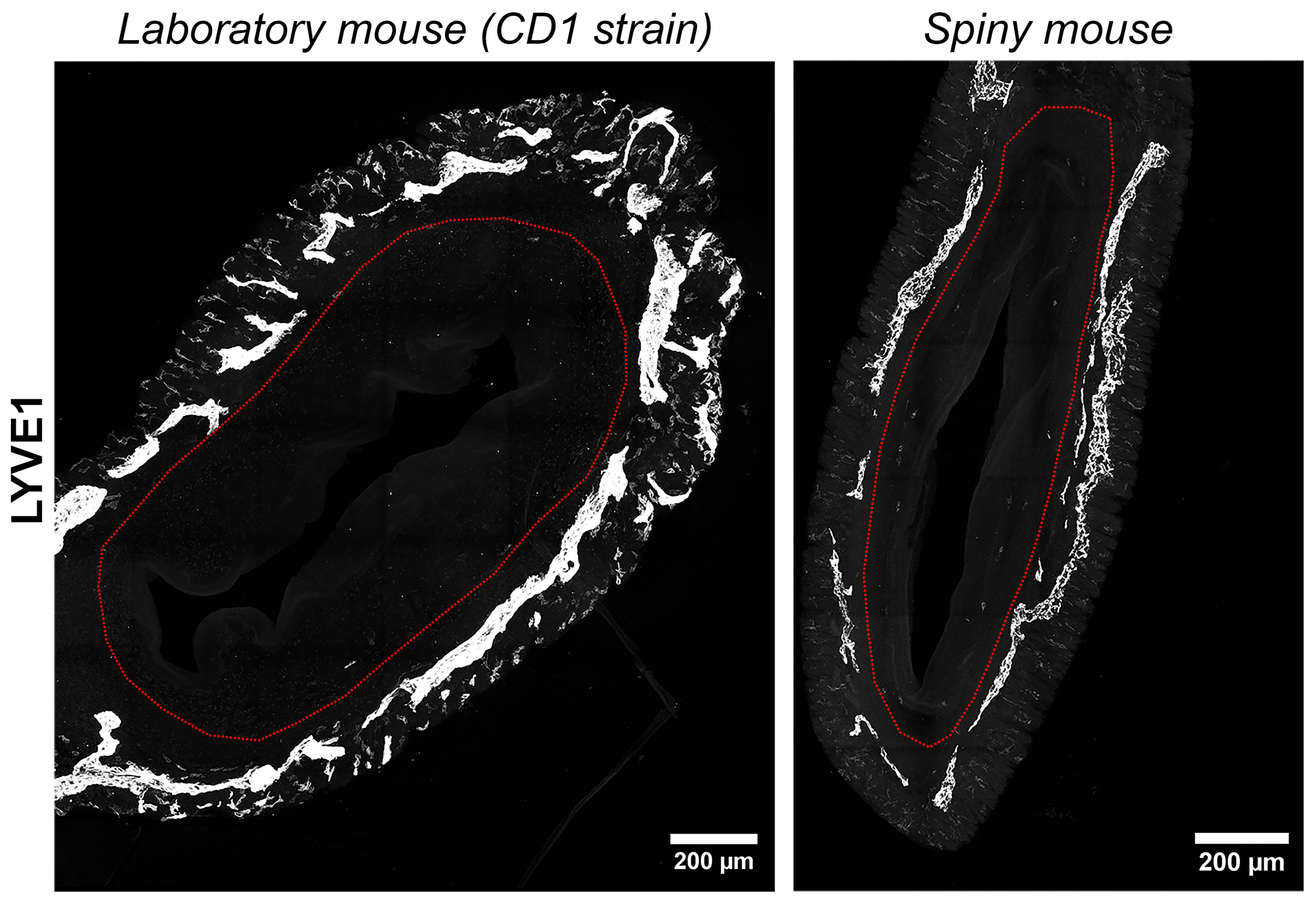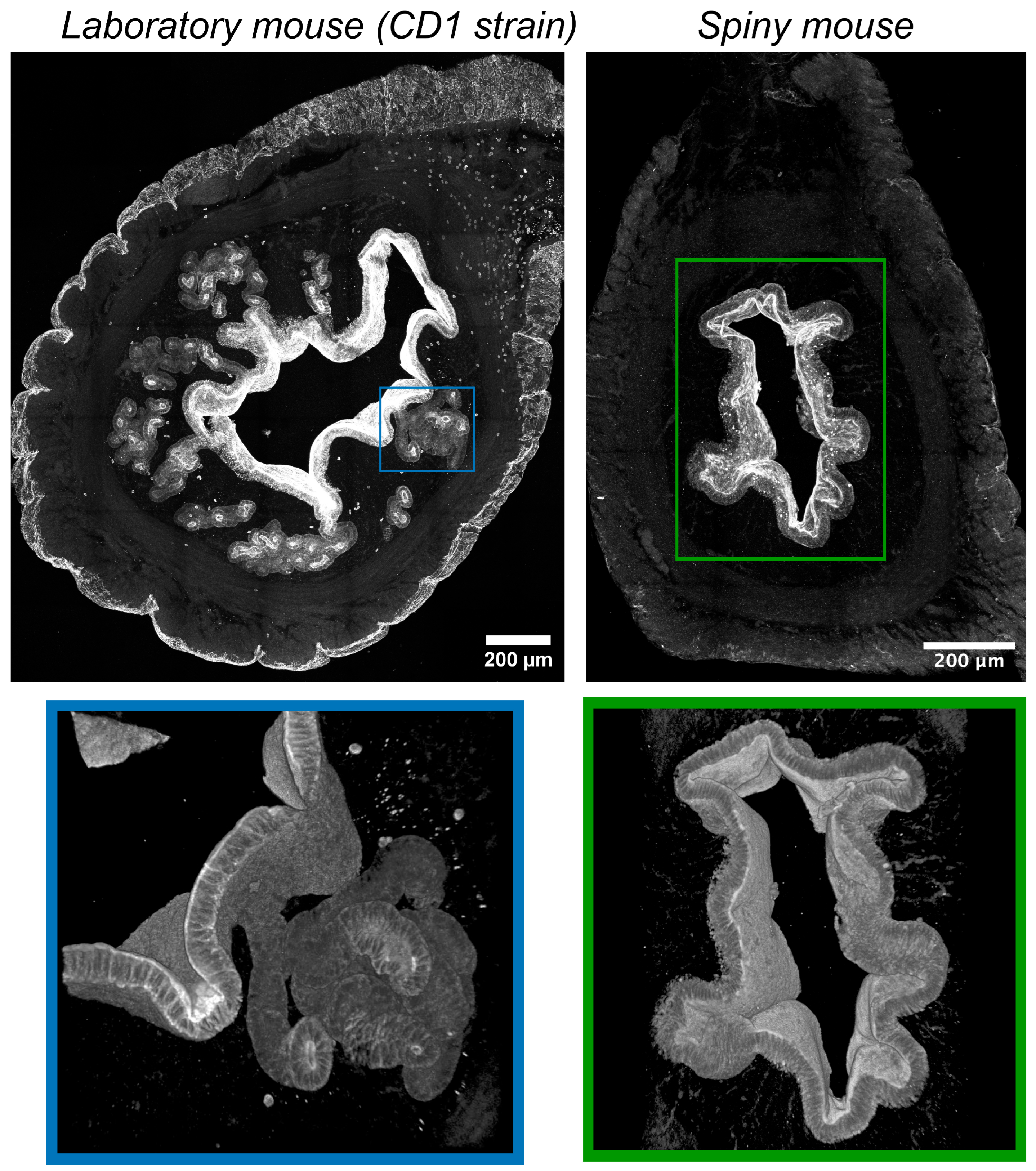 Two major differences between the spiny mice from our colony and CD1 laboratory mice were related to glandular structures and the innervation of endometrium (